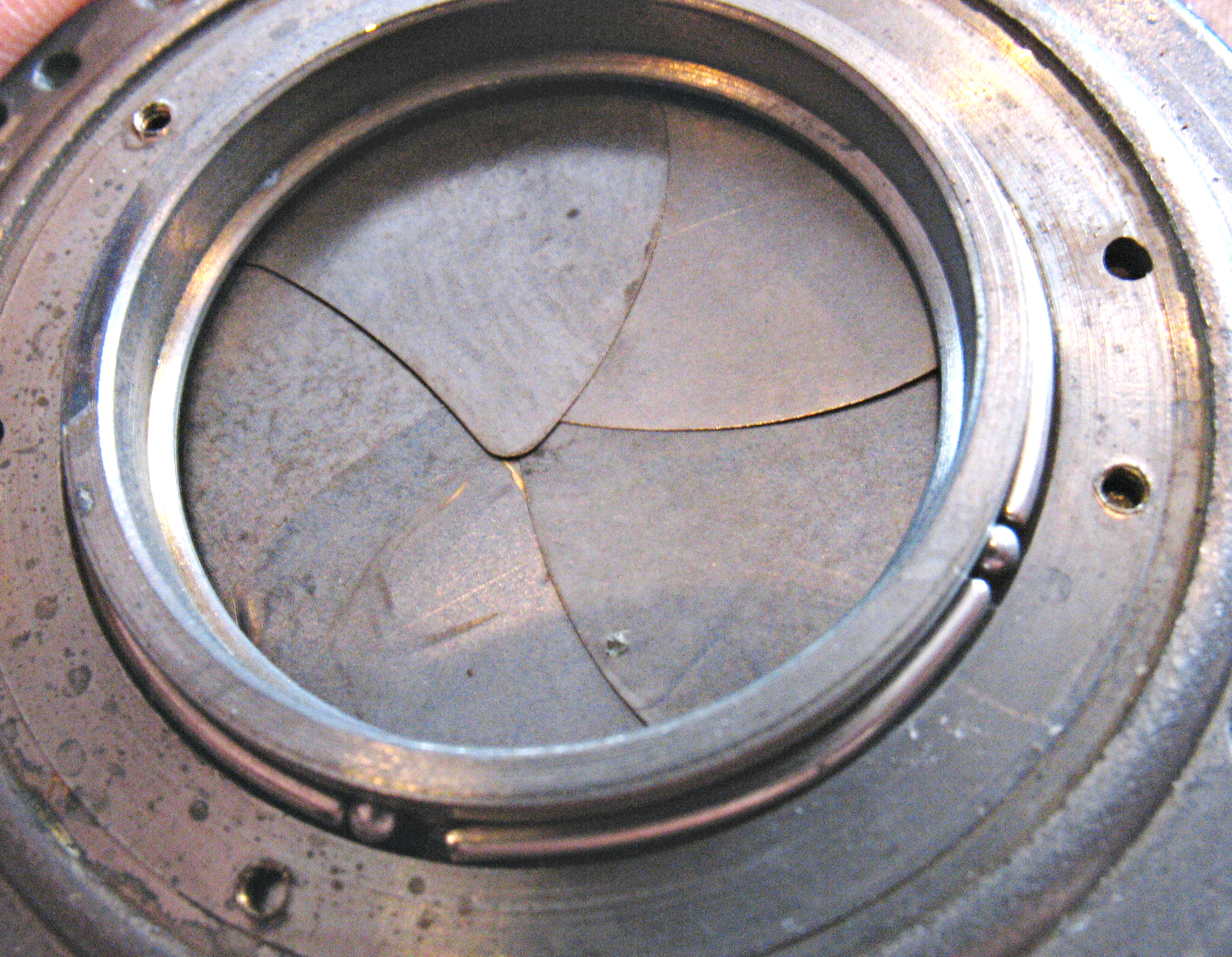 so that they can be reassembled onto the underlying pins in the shutter mechanism. Note that the five shutter blades are visible once the rear element is removed. Be careful not to get fingerprints on the blades, as the oils from your skin can be corrosive over time.