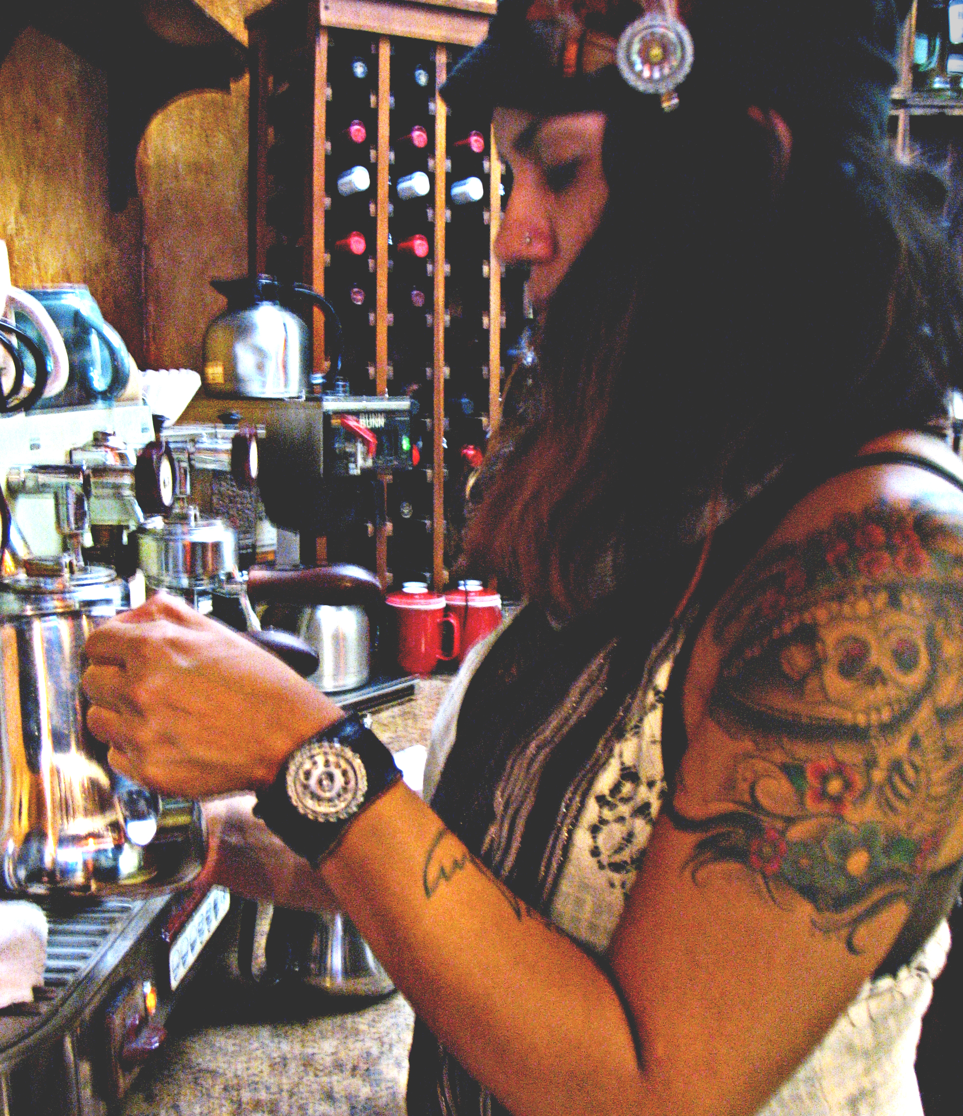 The most interesting feature, however, was the barista – a young Latina woman with silky black hair and a fascinating array of tattoos whose patterns linked her with her Aztec ancestors. After she served us with rich, flavorful coffee – obviously from a local specialty roastery – I complimented her on her tattoos and asked if I could photograph her. She kindly assented, and I slid in beside her as she prepared the next brew, catching her against the backdrop of the espresso machine and the wine rack.