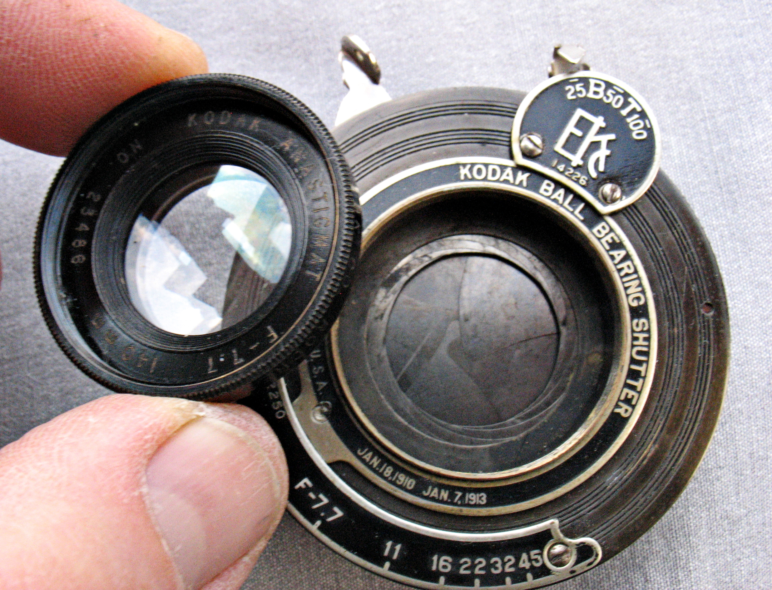 entered the shutter business in 1890 with their pneumatic “Iris Diaphragm” shutter. This was a “self-diaphragming” shutter, a precursor to the modern shutter with its separate aperture and shutter blades, in which one set of blades opened to a preset aperture, then closed at the the end of the exposure. Later B&L pneumatic shutters such as the Victor had both shutter blades and an iris diaphragm.